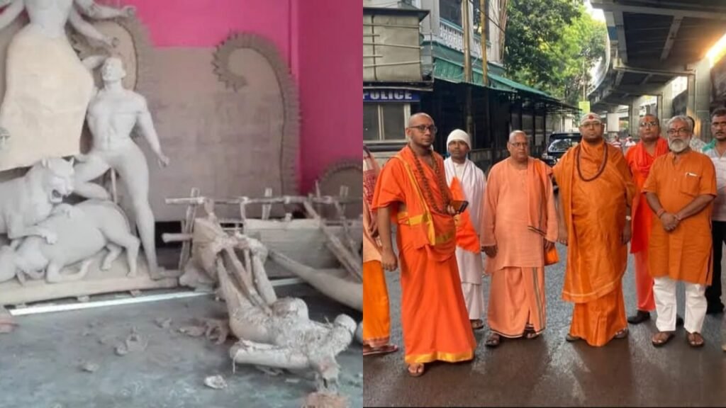 Several Hindu organizations led by Mahamandaleswar Swami Paramatmananda Bhairav, Bengal head of Sri Panchayeti Mahanirbani Akhada in Bengal staged a demonstration outside the Bangladesh Deputy High Commission in Kolkata, protesting the reported vandalism of a Durga idol at Kashim Pure in Bangladesh. The protestors gathered near the mission, chanting slogans and demanding immediate steps to ensure the safety of Hindus in Bangladesh. The groups also submitted a deputation to Deputy High Commissioner officials, urging action and protection for minorities in the neighboring country. In a memorandum handed to the mission, the signatories including Swami Ranjitananda Giri, Mahamandaleswar of Juna Akhada condemned what they described as a “shocking act of intolerance” that deeply hurt the sentiments of Hindus. “This incident has caused widespread anguish among peace-loving people,” the letter stated. “The deputation laid out three key demands: swift punishment for those responsible for the vandalism, preventive measures to safeguard minority communities and their places of worship, and guarantees of security during religious and cultural festivals,” said Swami Paramatmananda Bhairav. Protestors said the targeting of Durga idols, particularly ahead of the upcoming festival season, was alarming and risked sparking further tensions. “We strongly urge the Bangladesh authorities to ensure that Hindus can celebrate their traditions without fear,” one protestor told reporters. The memorandum was also marked to the Ministry of Foreign Affairs in Dhaka, the Indian Prime Minister’s Office, the Union Home Minister, the External Affairs Minister, the West Bengal government, and the Governor of West Bengal. Organizers said the protest was not only about the Kashim Pure incident but about a broader pattern of alleged attacks on minorities across Bangladesh. They appealed for bilateral intervention to protect religious harmony. There was a strong police presence around the mission to ensure order, and the demonstration remained peaceful. The Bangladesh Deputy High Commission had not immediately responded to the deputation. However, officials have previously said that the government in Dhaka is committed to protecting minority rights and punishing offenders involved in communal violence. For now, Hindu groups in Kolkata say they will continue to monitor the situation and press for assurances that such incidents will not be repeated.